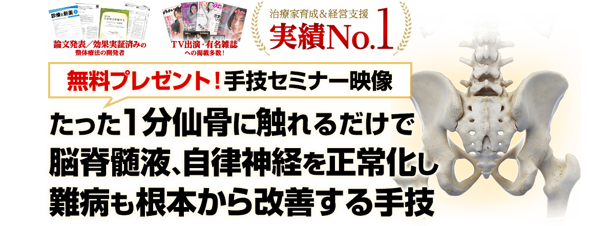 - 1分仙骨に触れて自律神経と脳脊髄液を正常化する「仙骨内臓テクニック」を直接伝授するので、どんな重症も改善できるようになり臨床で結果を出せます。